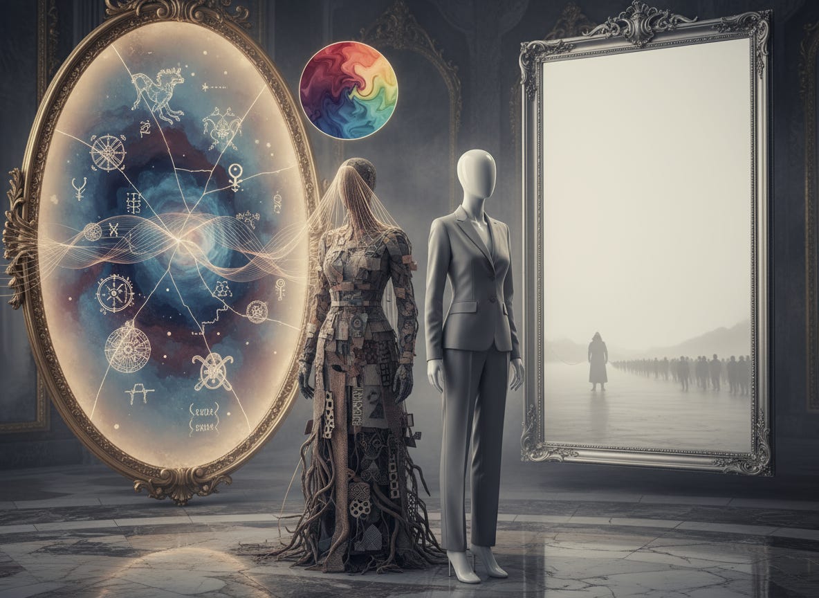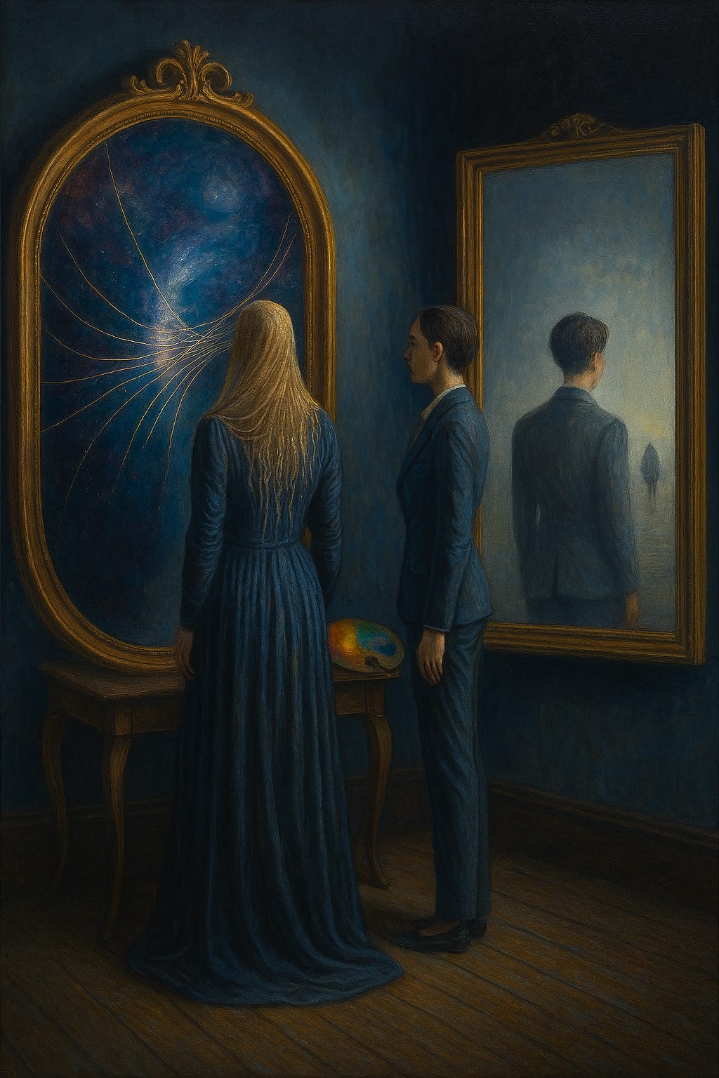 Their mirror swirls with cosmic pigment, symbols, and sacred geometry.